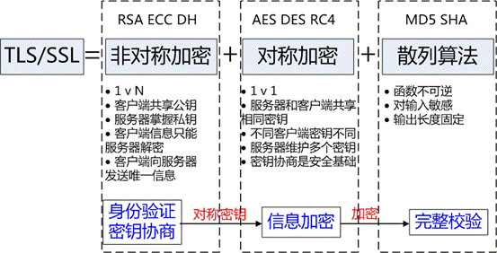 TLS/SSL的功能实现主要依赖于三类基本算法: 散列函数 Hash, 对称加密和非对称加密, 其利用非对称加密实现身份认证和密钥协商, 对称加密算法采用协商的密钥对数据加密, 基于散列函数验证信息的完整性.